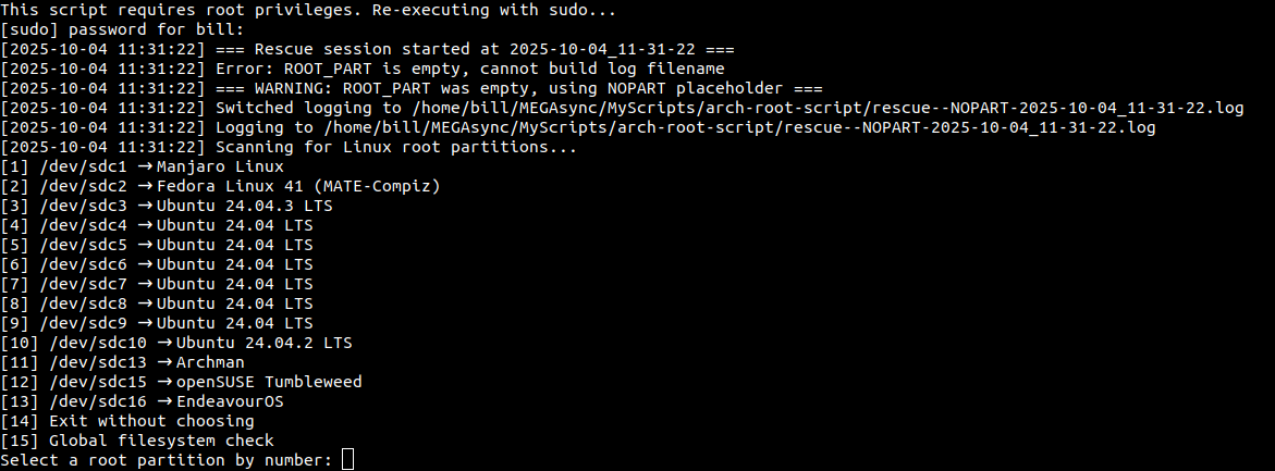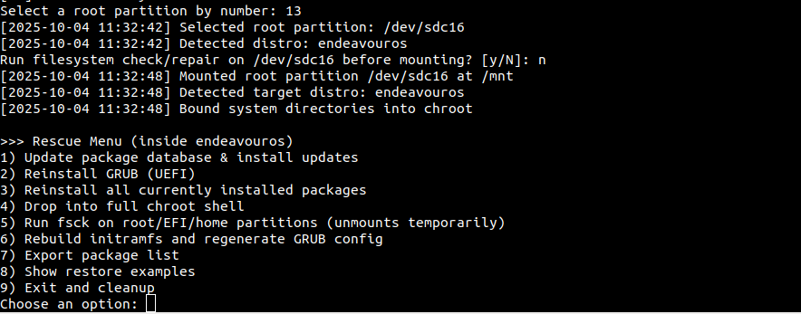 This script I developed to help save a corrupt install of EndeavourOS that would not start up.